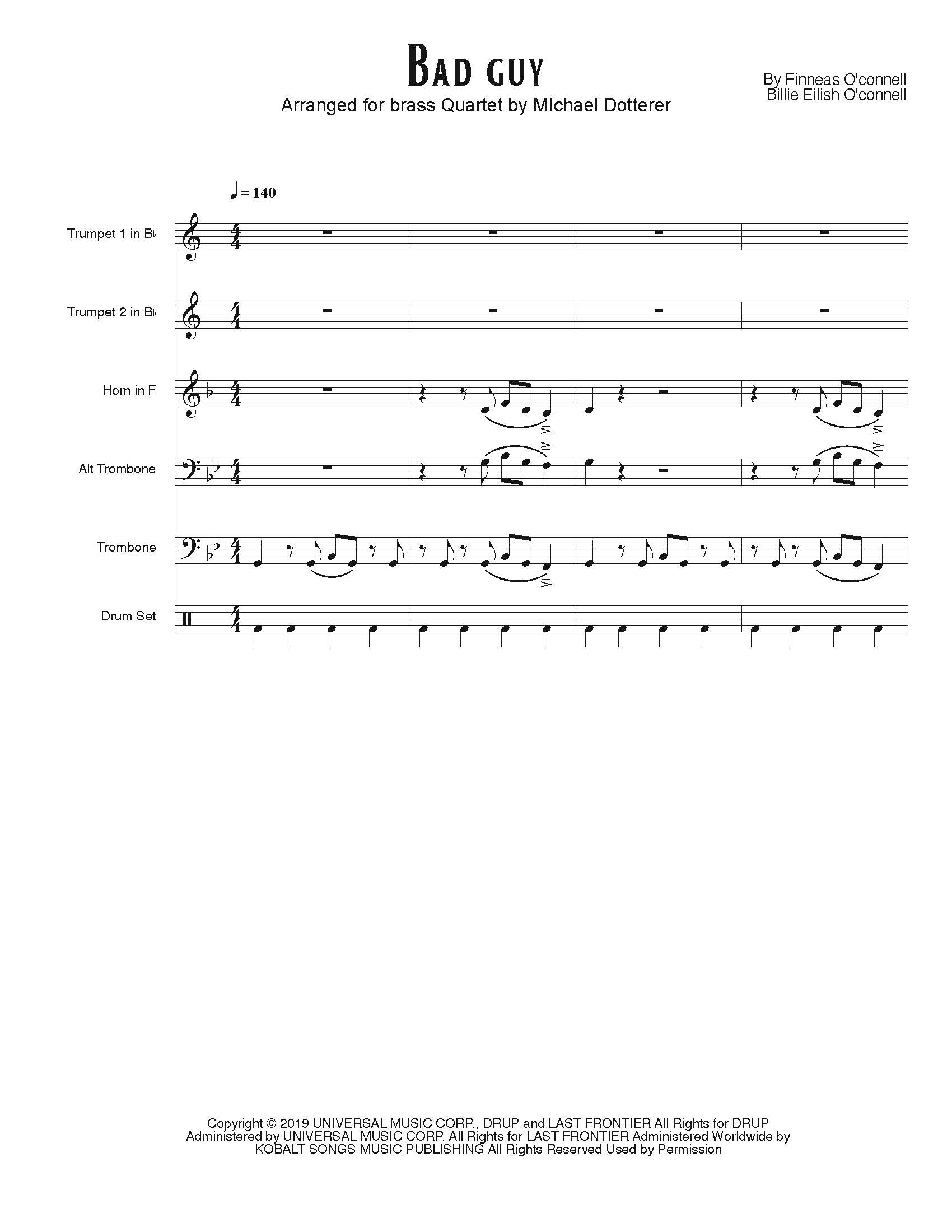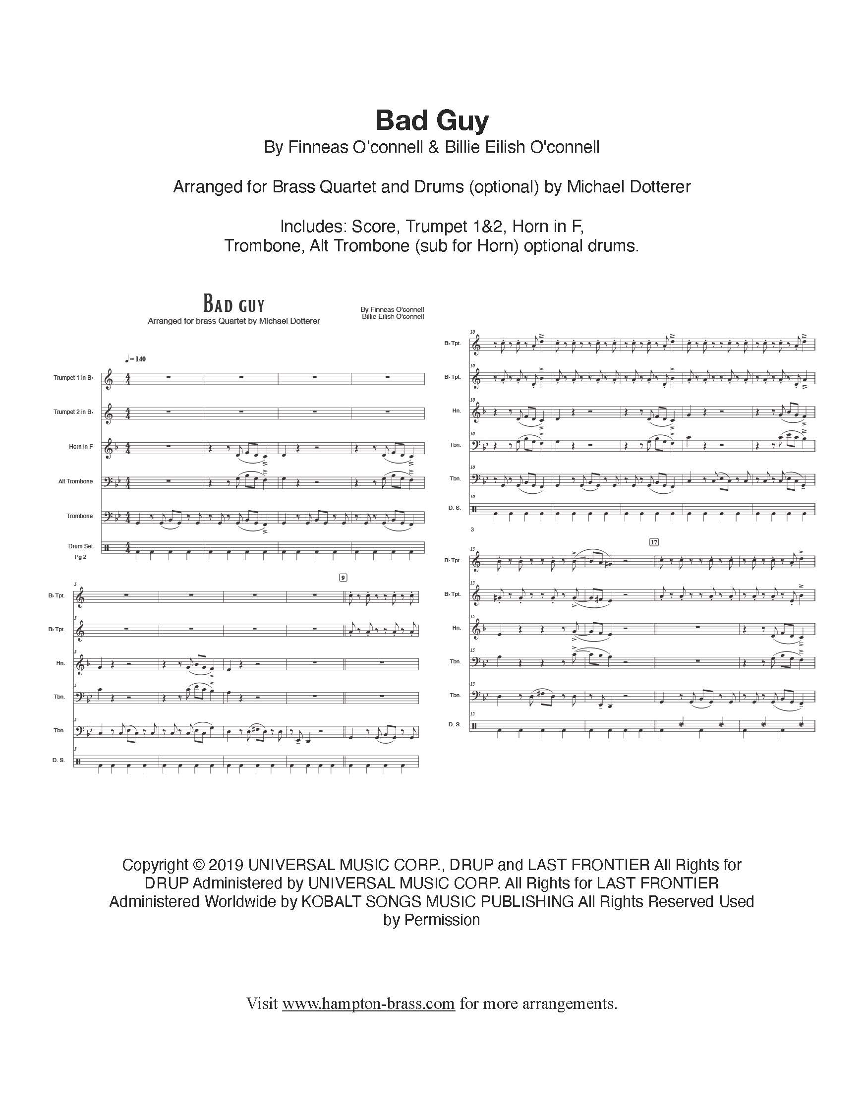 Bad Guy arranged for Brass Quartet and Drums (optional) by Michael Dotterer. Includes: Score, Trumpets 1&2, Horn in F, Trombone (goes down to low D), Alt Trombone (sub for Horn) and optional drums. 24 pages