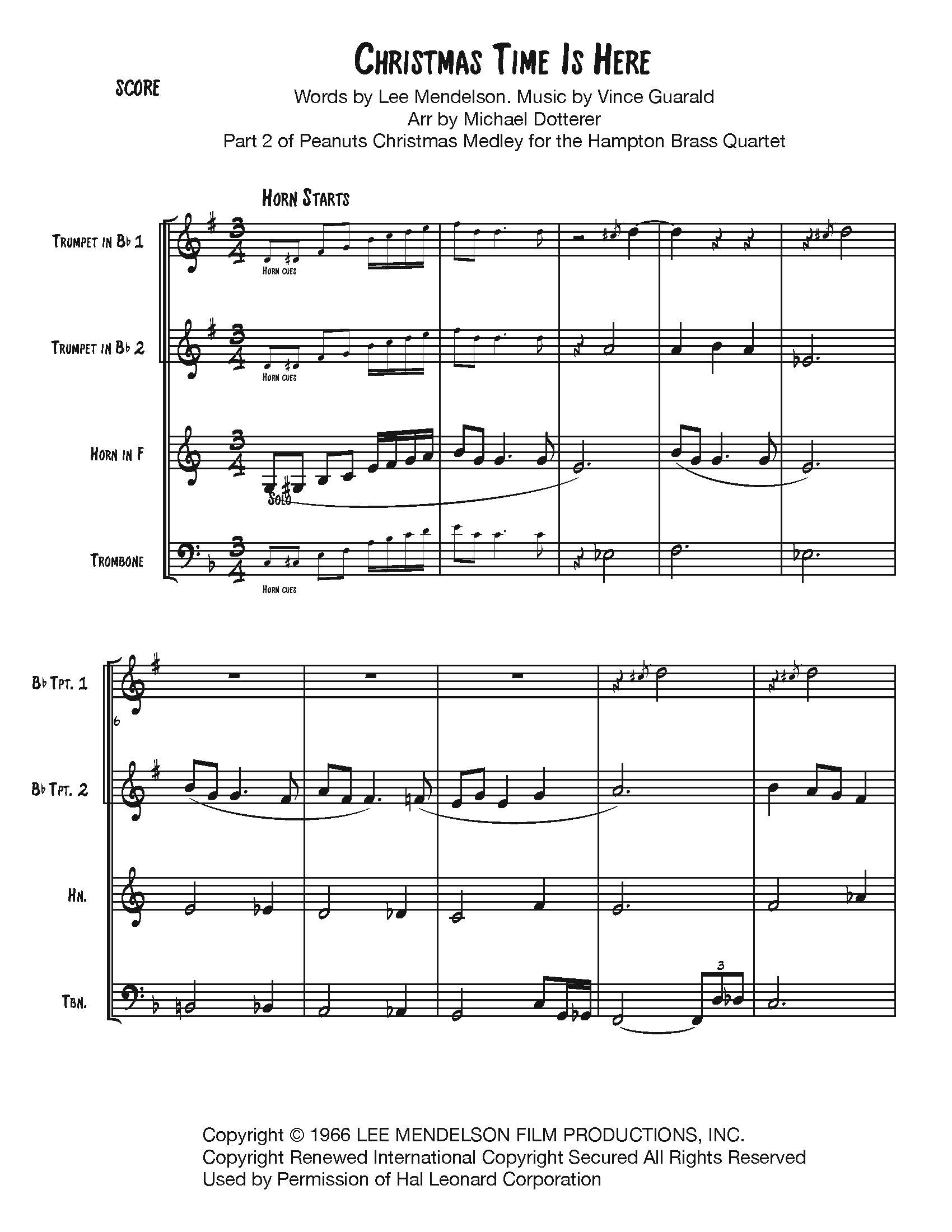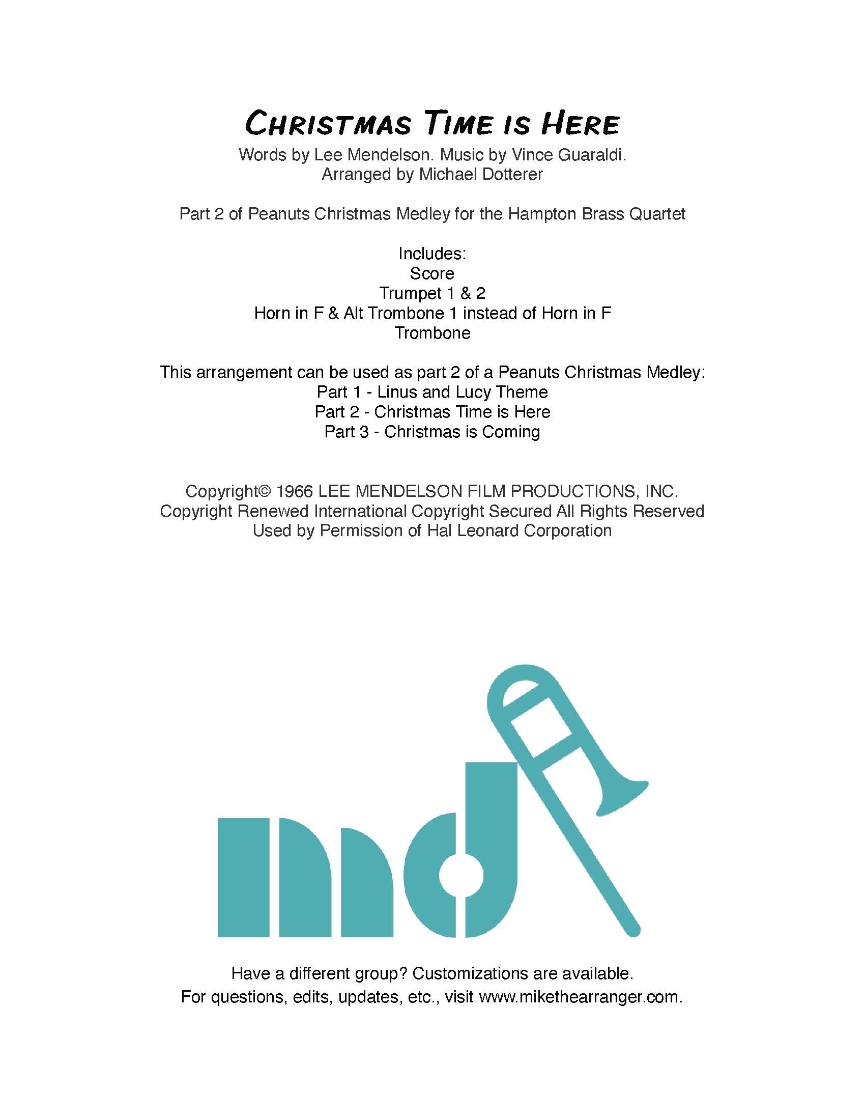 Originally arranged for The Hampton Brass Quartet as part of a larger Peanuts medley of Linus & Lucy, Christmas Time is Here, and Christmas is Coming. For information on the whole Peanuts medley, contact me.