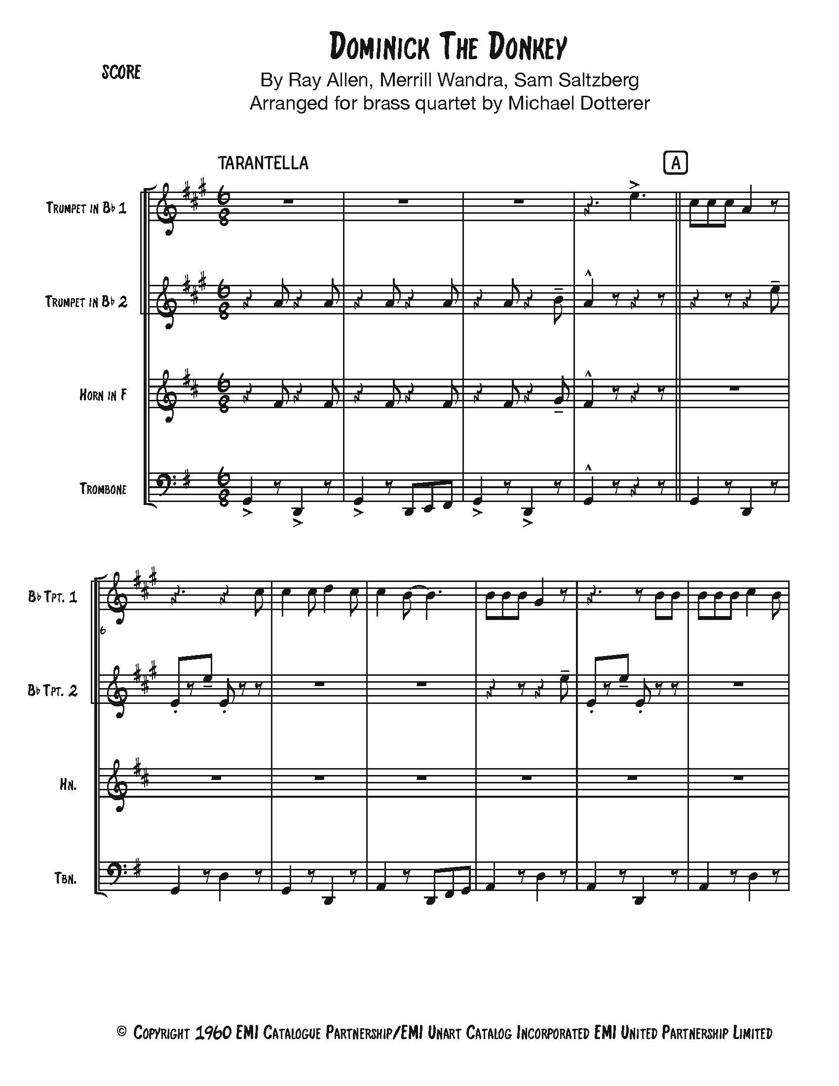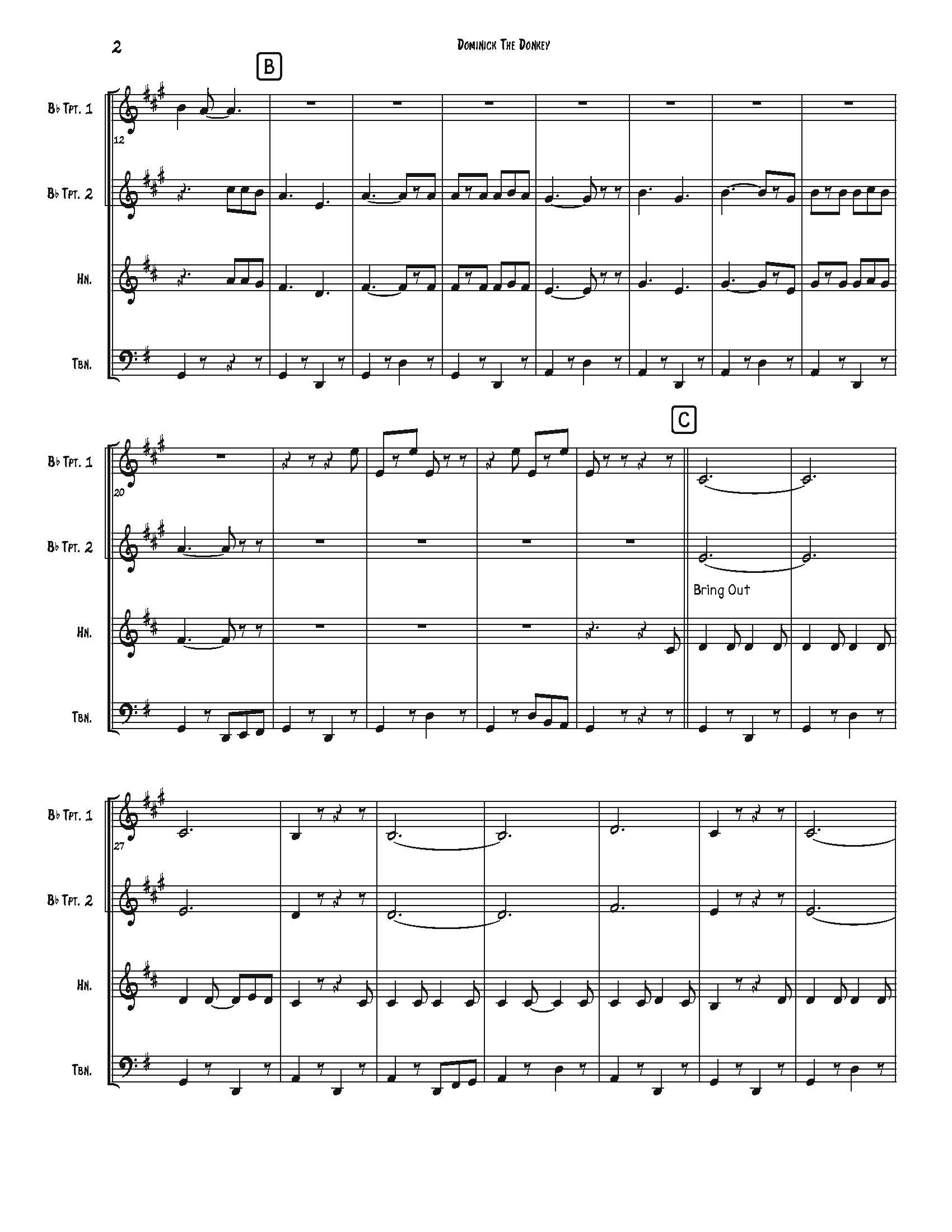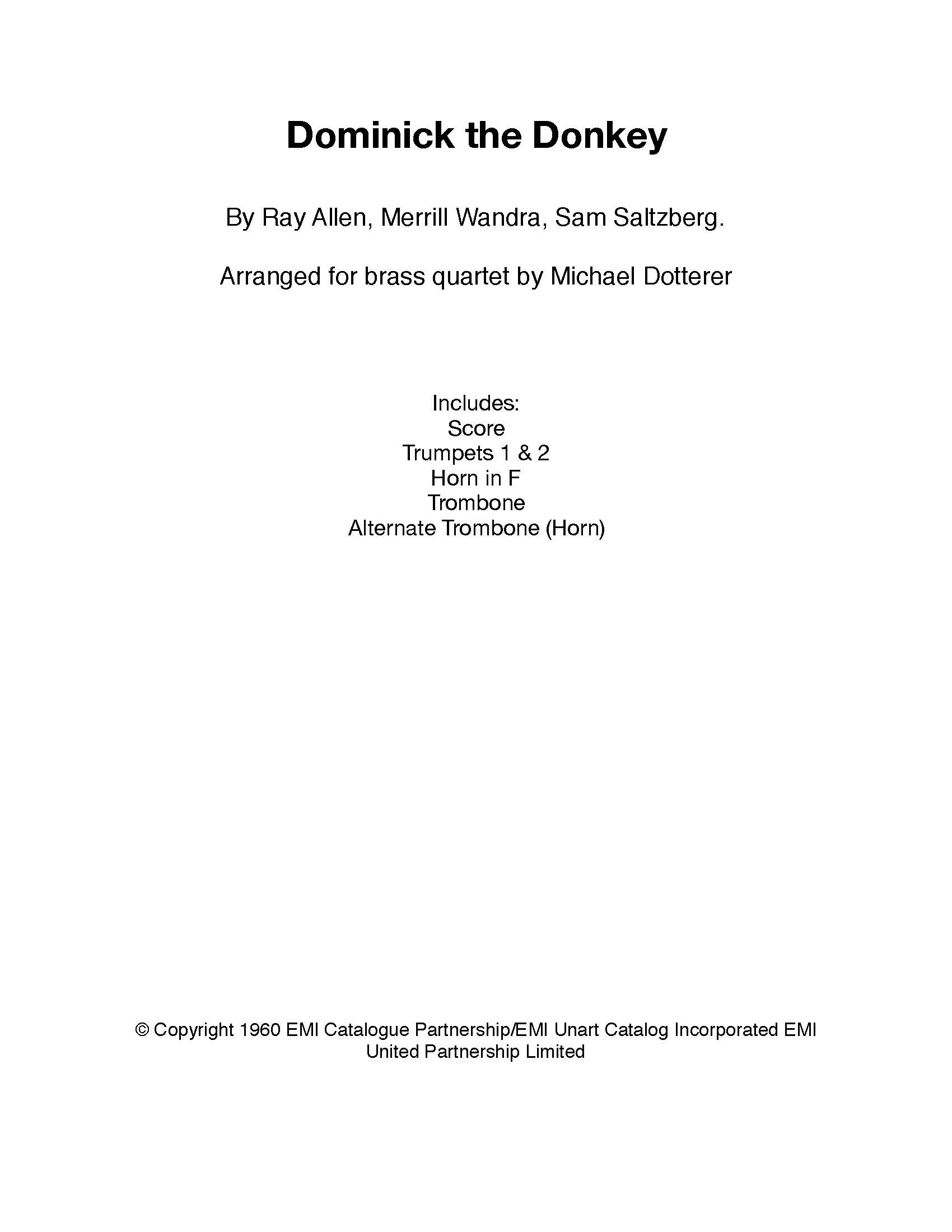 Dominick, the Donkey arranged for brass quartet. Parts included are 2 trumpets, horn in F, trombone and an alternate trombone for the horn part. 2110. Trombone goes down to a low D.