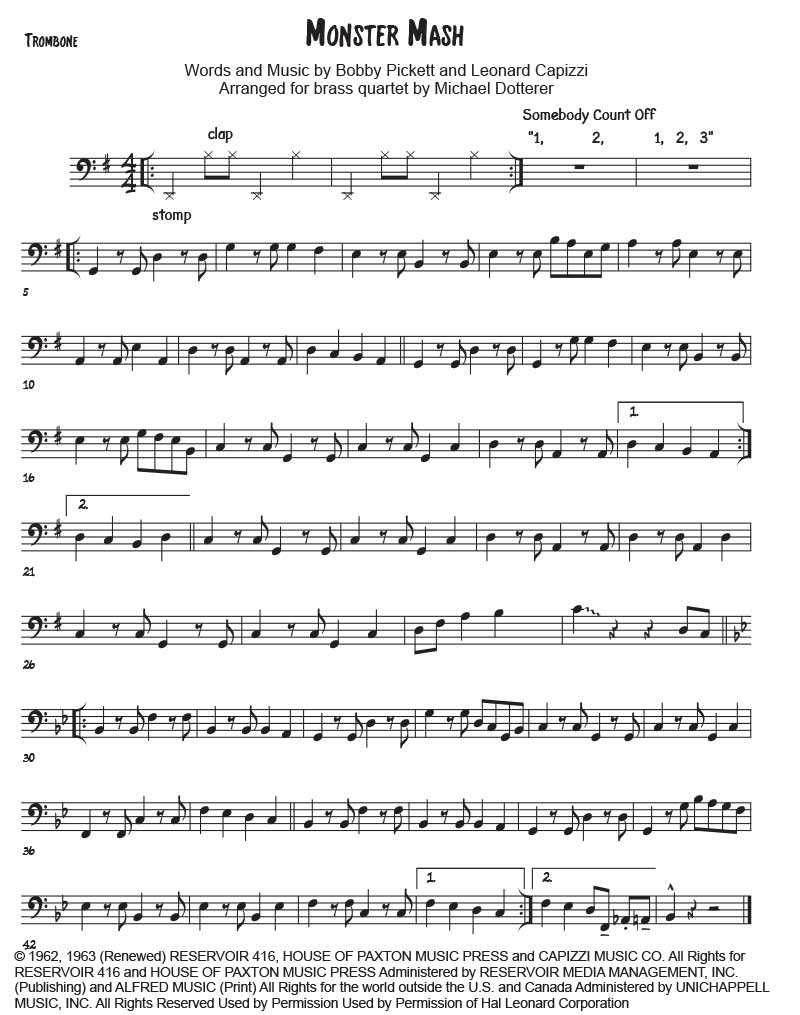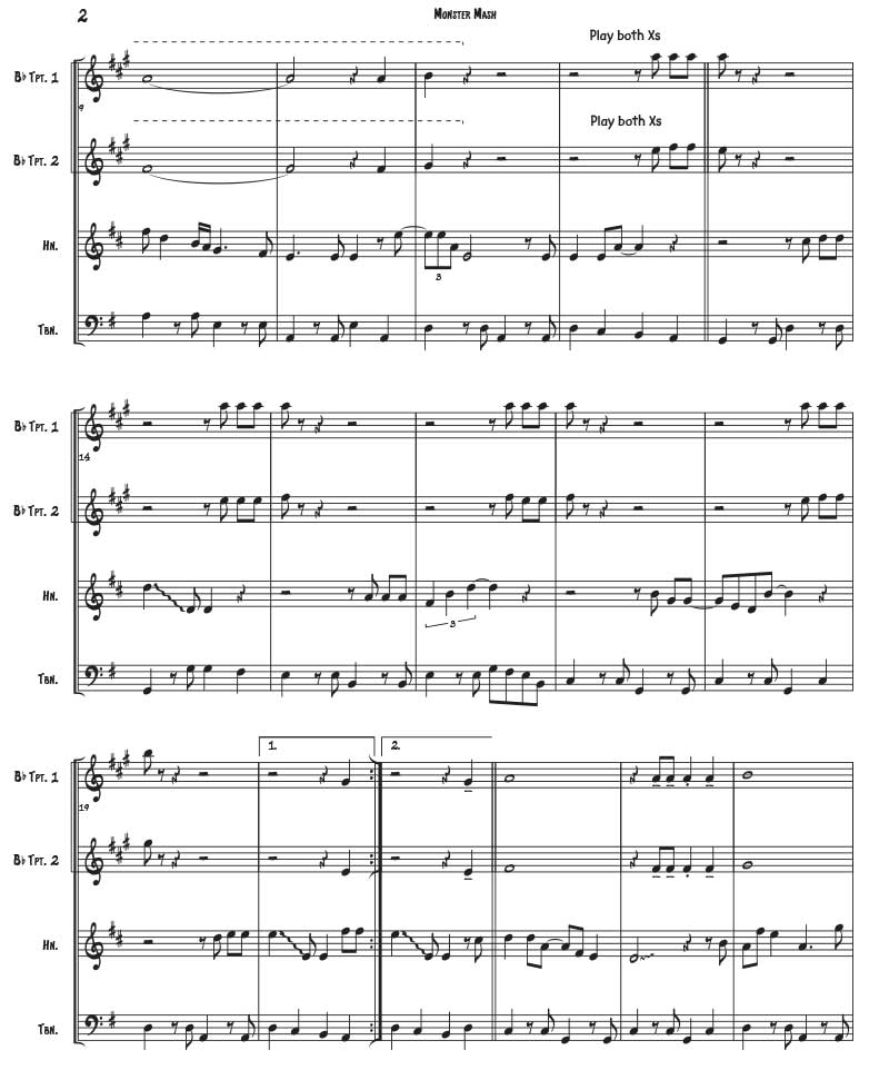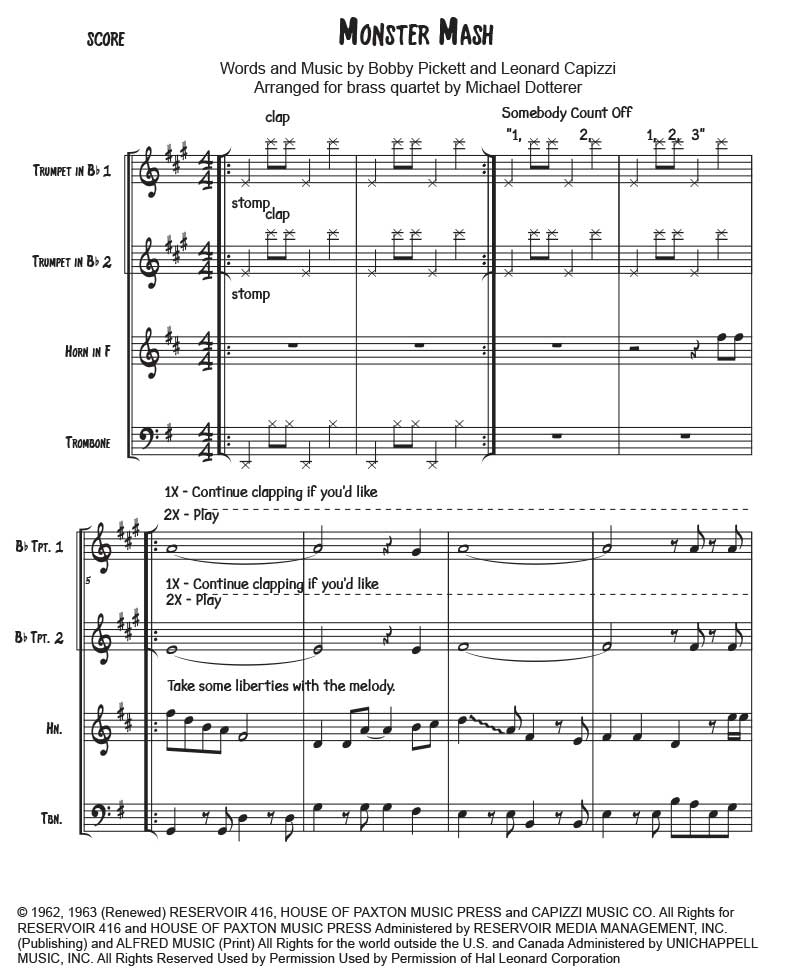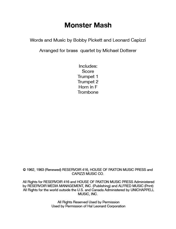 Great for Halloween! By Bobby “Boris” Pickett and Leonard Capizzi. Arranged for 2 trumpets, Horn in F and Trombone (2110). Horn has the melody for the first half of it. Score and parts. 9 pages.
