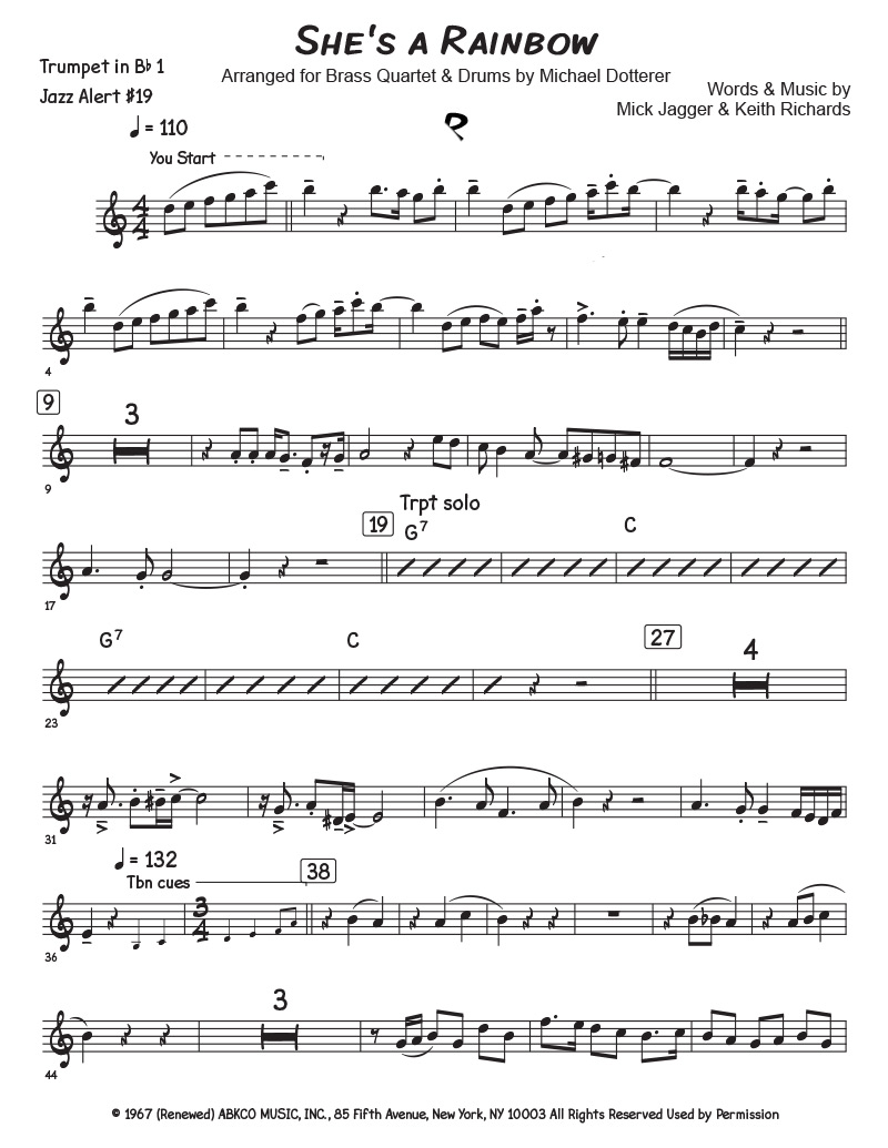 This arrangement opens with the introduction similar to the Rolling Stones song, quickly moves into a quasi New Orleans style with an improvised trumpet solo, treats the interlude in 3, back into the brass band style and ends like it begins. Fun piece to play.
