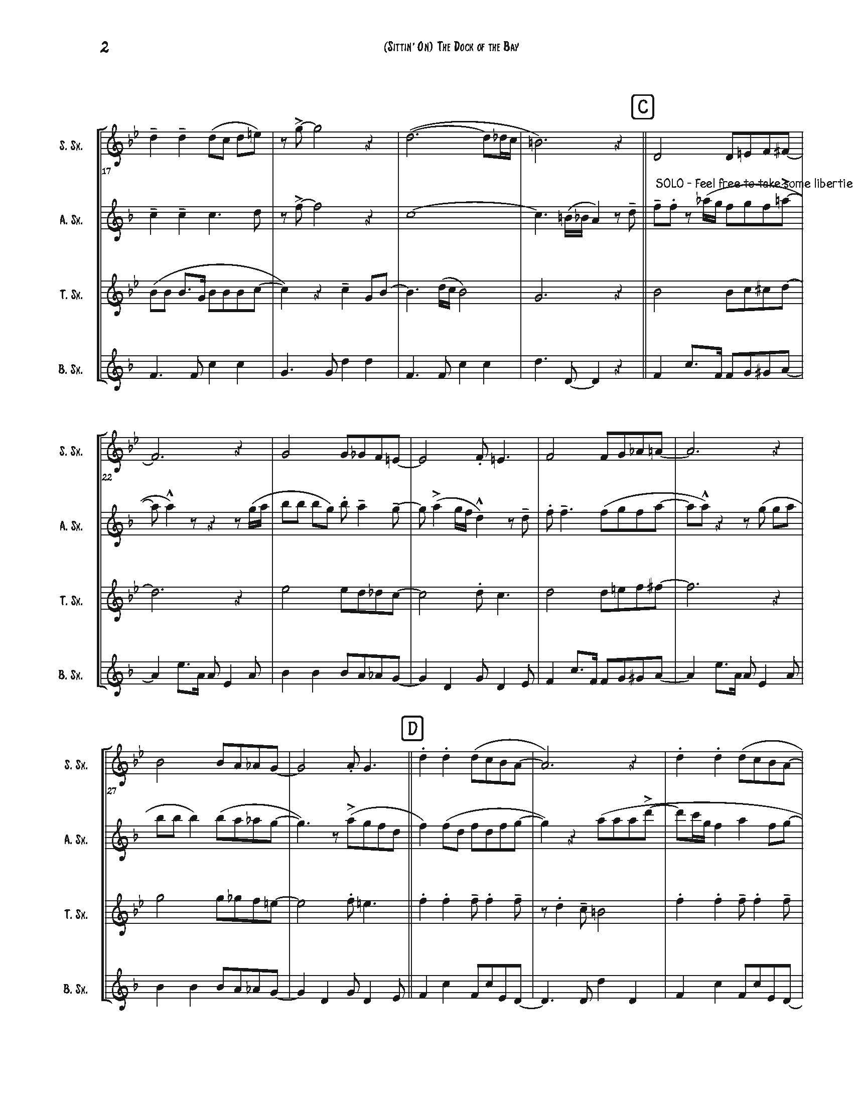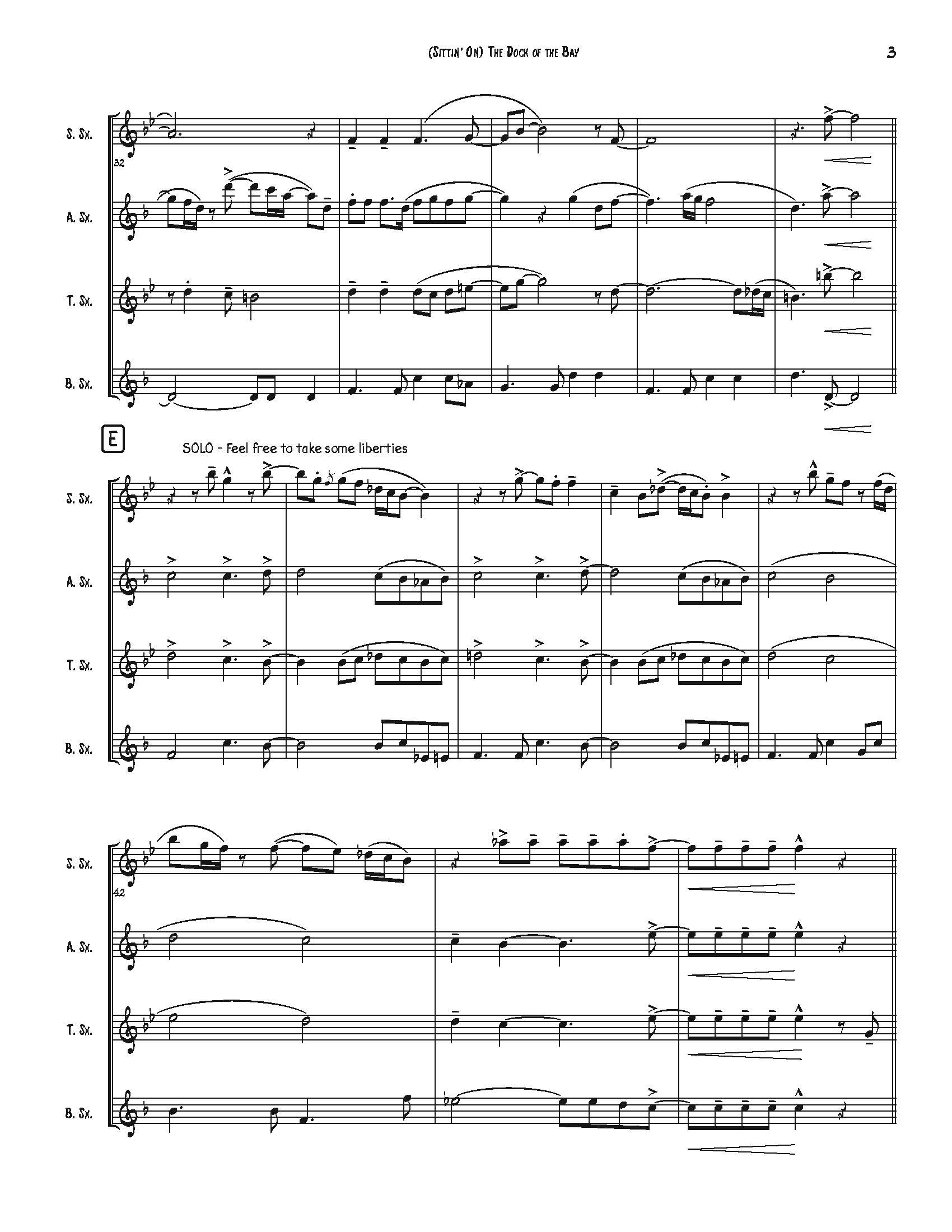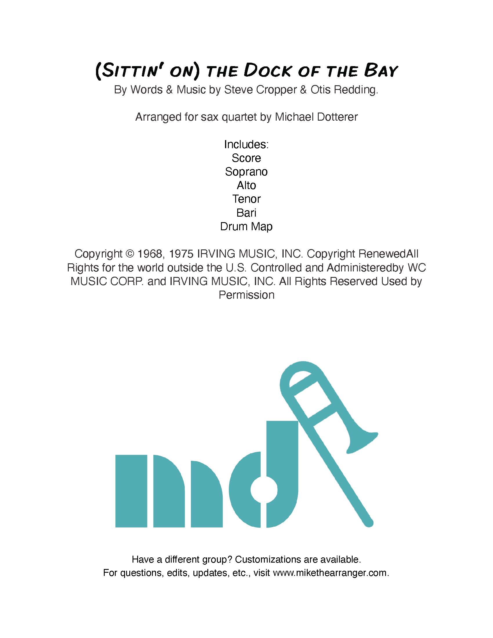 (Sittin’ On) The Dock of the Bay for sax quartet. Parts: Soprano, Alto, Tenor, Bari, drum map and a score.