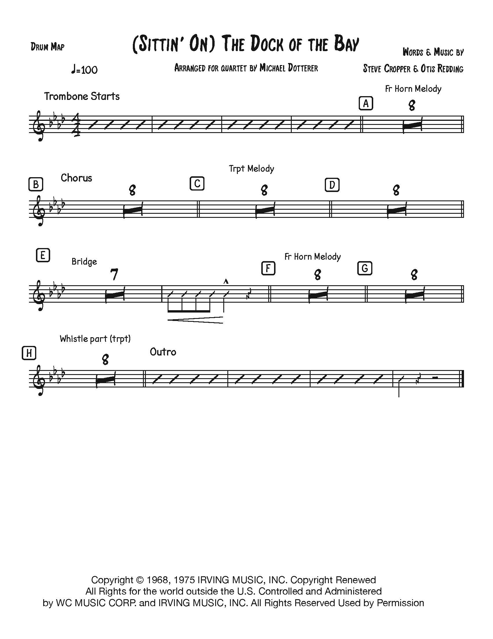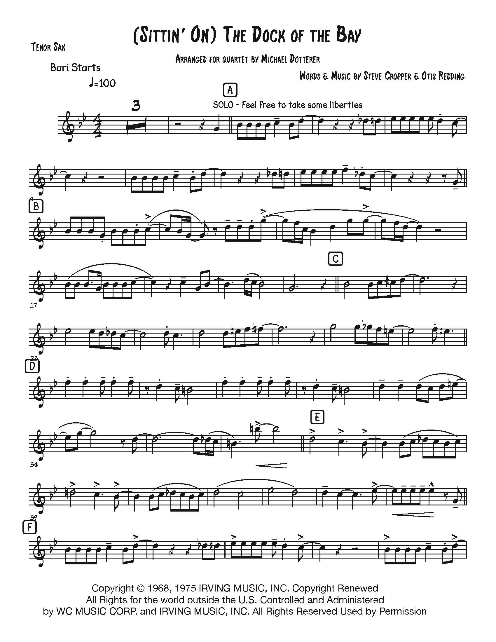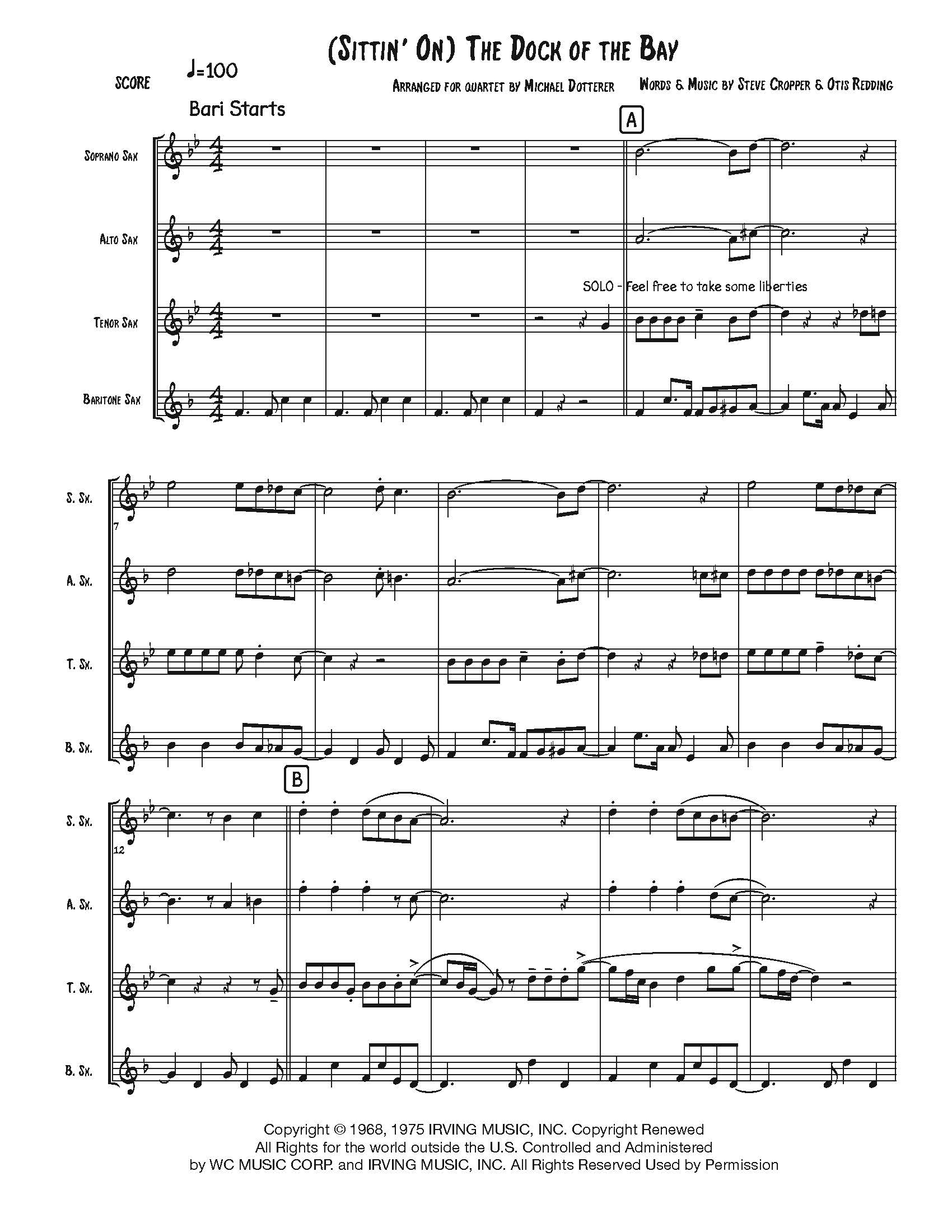 (Sittin’ On) The Dock of the Bay for sax quartet. Parts: Soprano, Alto, Tenor, Bari, drum map and a score.