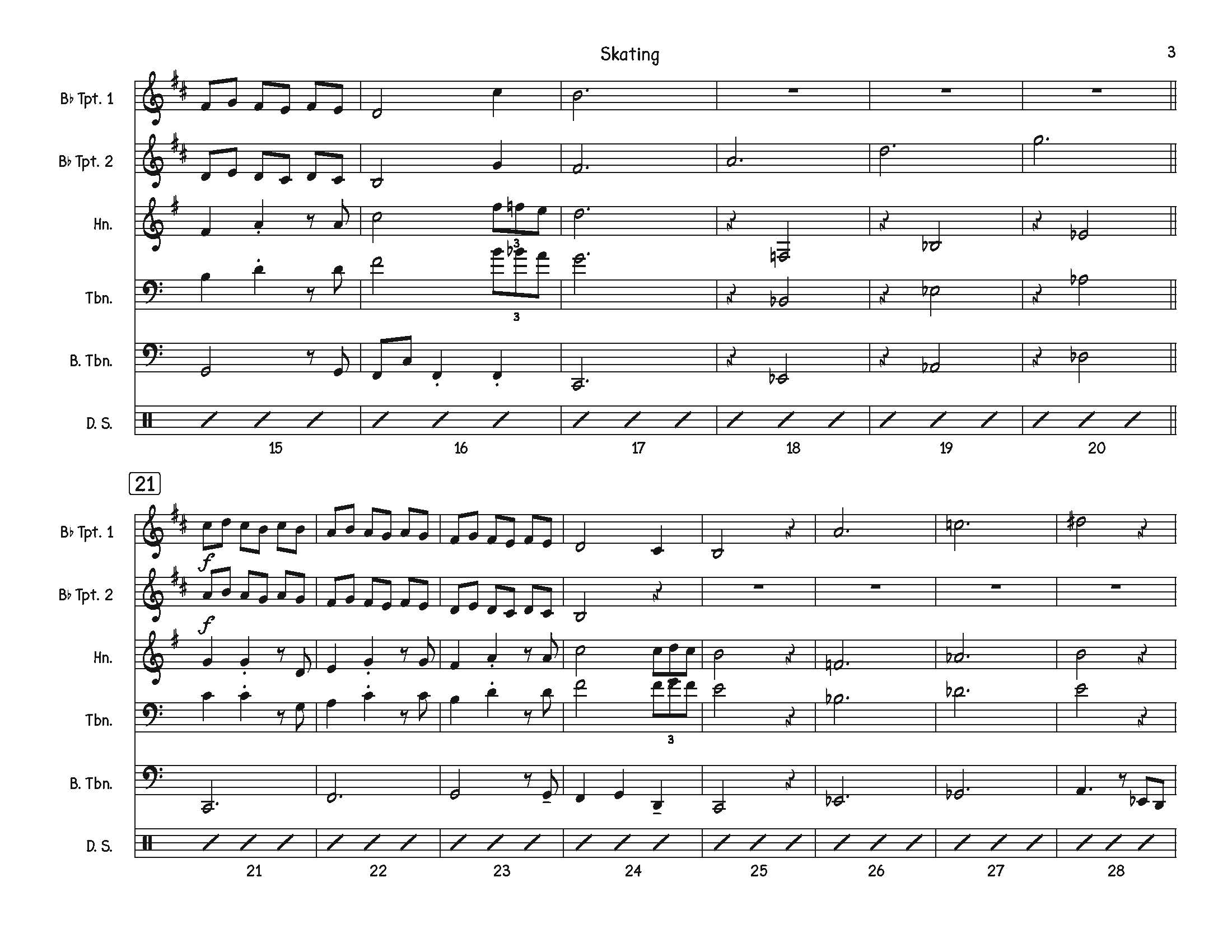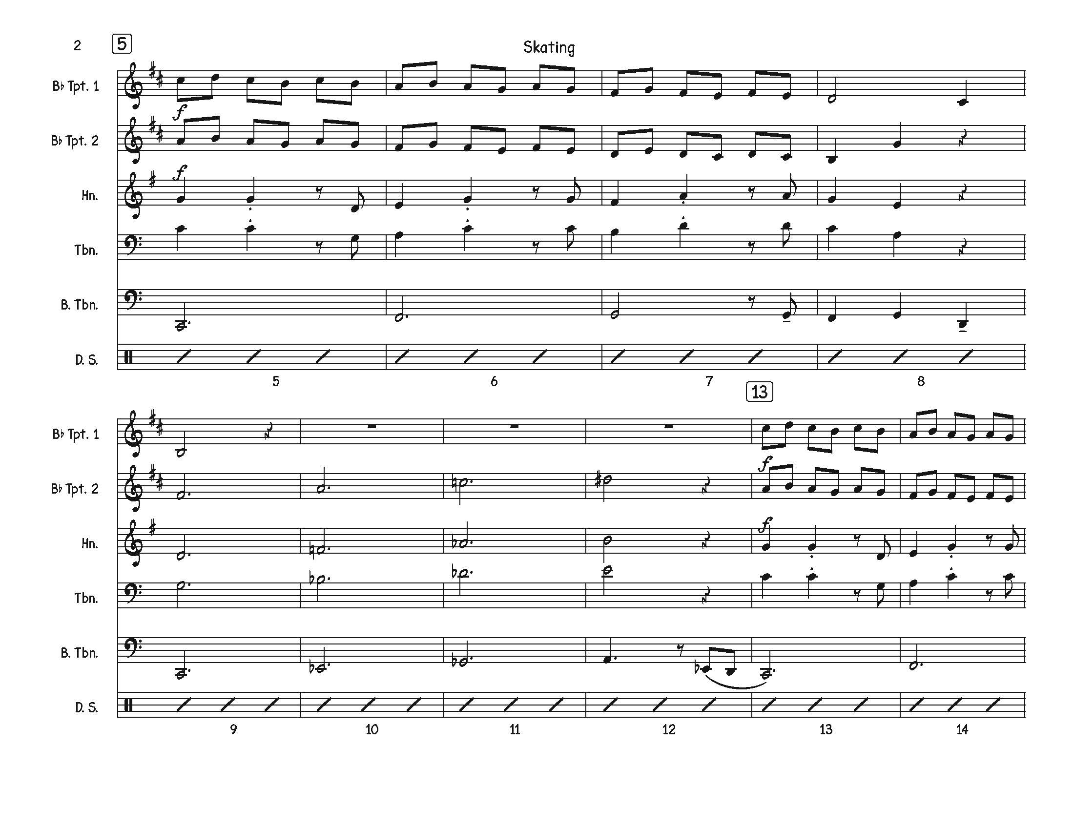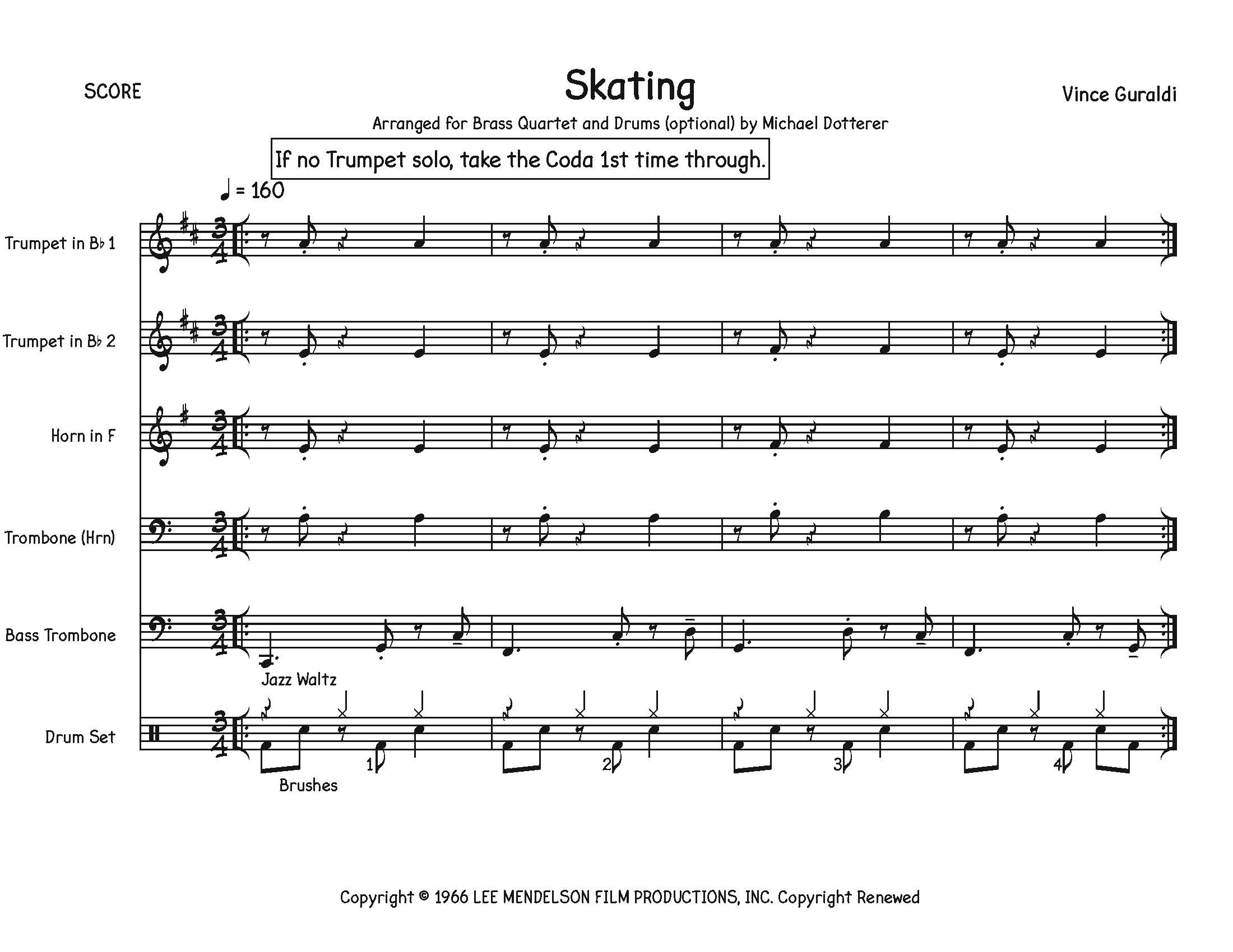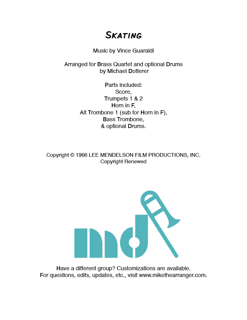 By Vince Guaraldi. Arranged for 2 trumpets, horn in F (with alt trombone 1), bass trombone and optional drums. Includes a score and parts. 20 pages. There’s an optional improvised solo for either trumpet part. You can also just take the coda to skip the solo section.