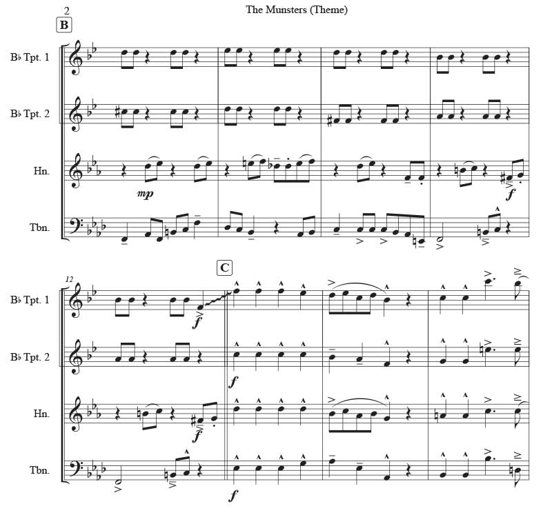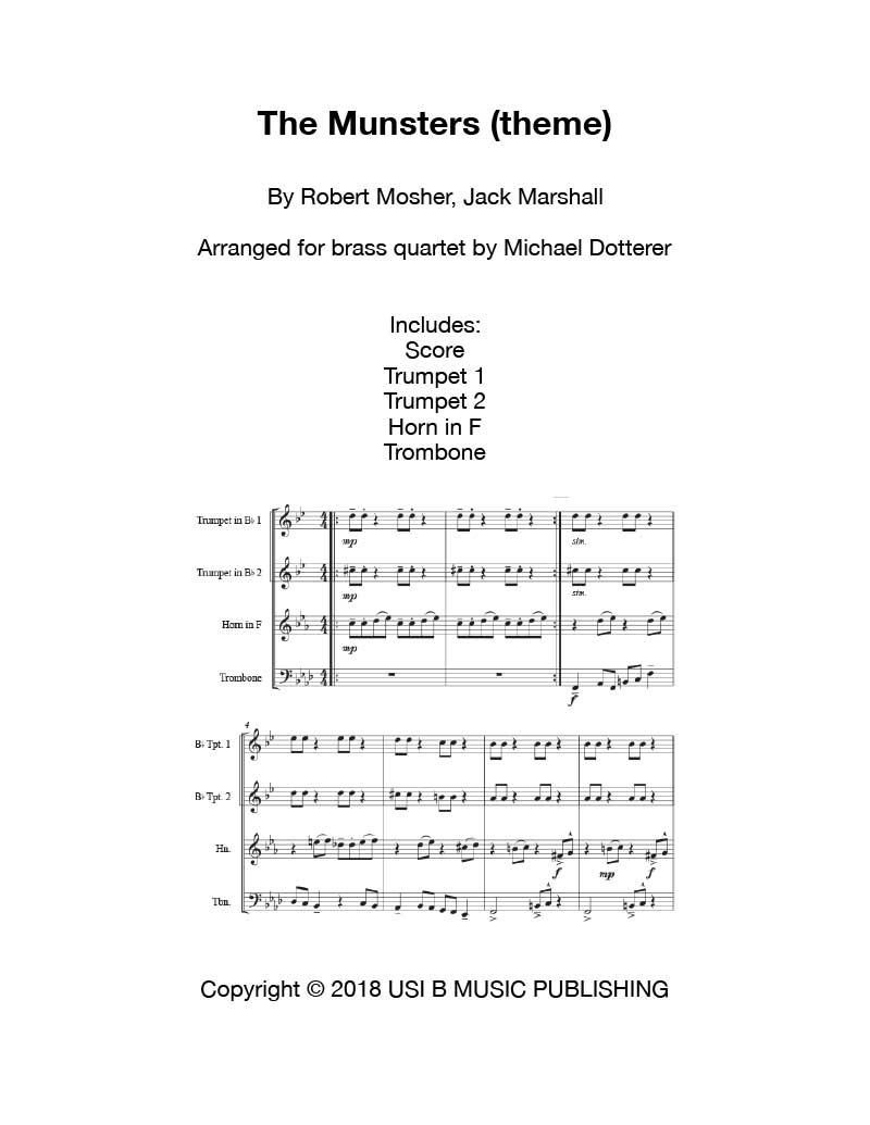 Composed by Jack Marshall. Arranged for 2 trumpets, horn in F and trombone. Score and parts. 10 pages. Rated Advanced Intermediate rating due to the range.