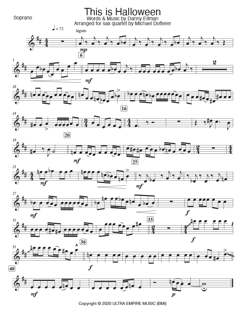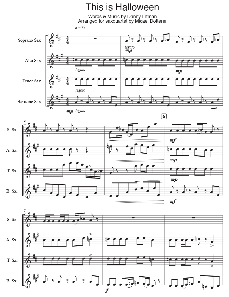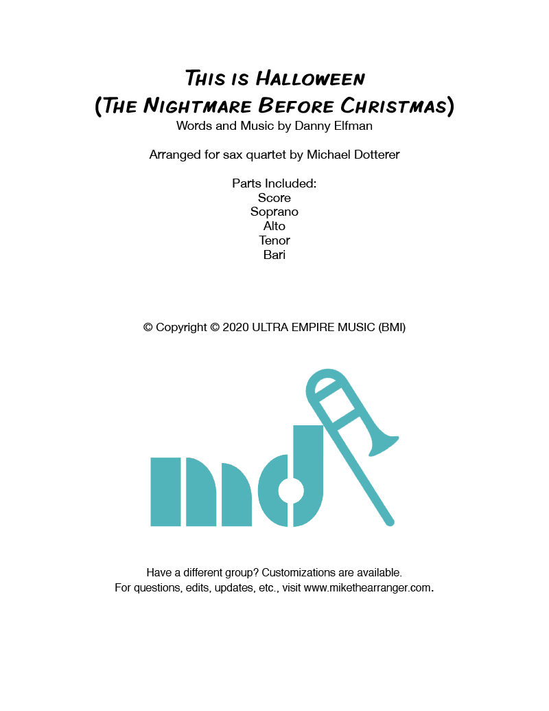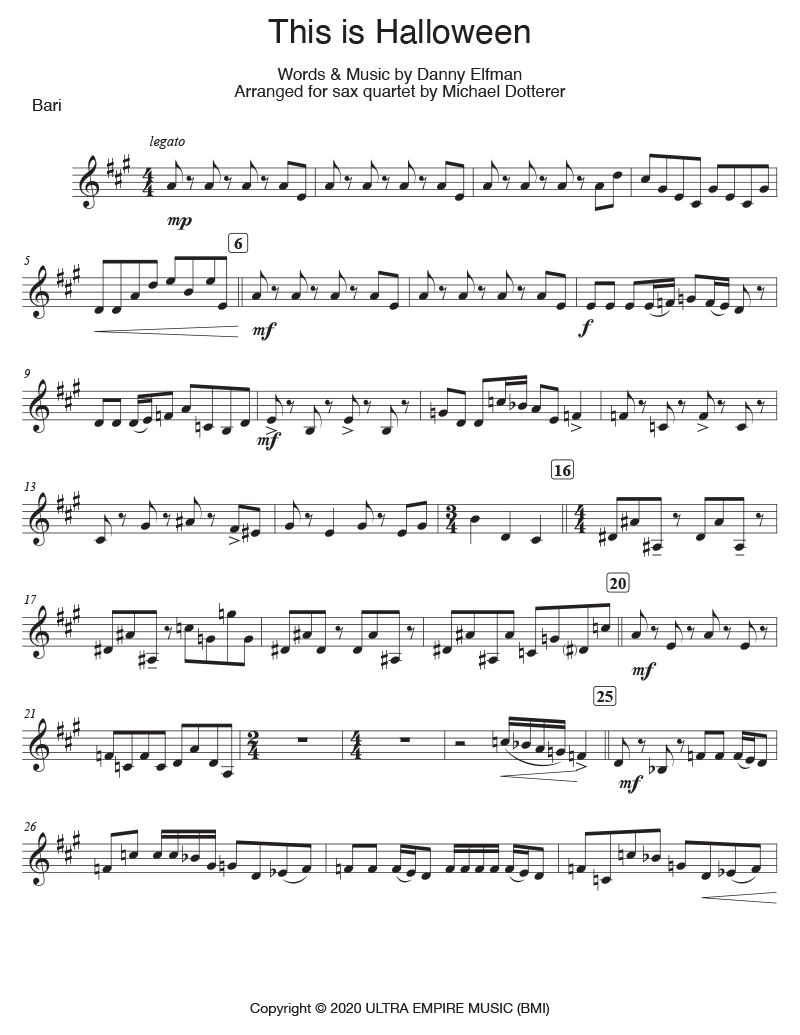 Halloween classic arranged for sax quartet. Parts included: Soprano Sax, Alto Sax, Tenor Sax, Bari Sax and a score.
