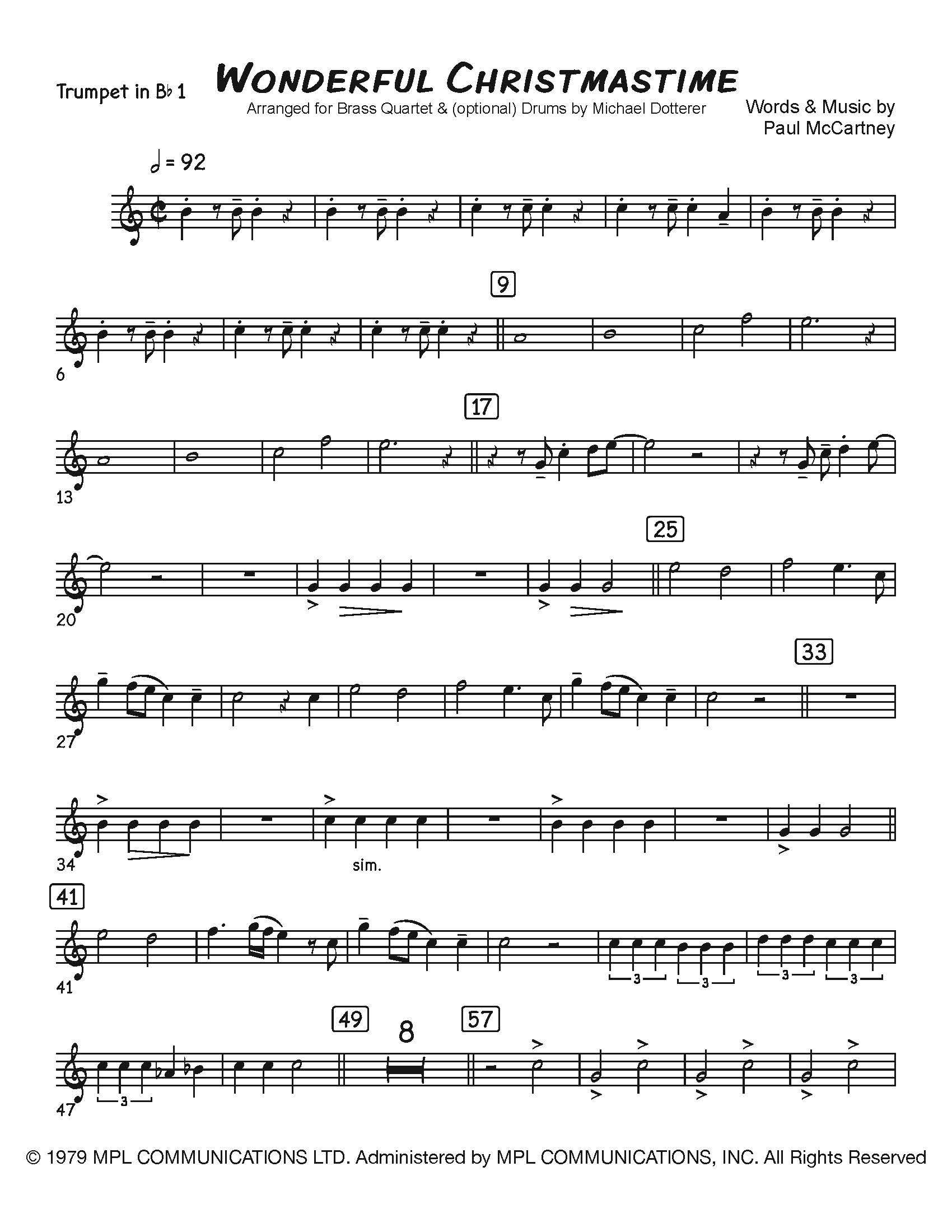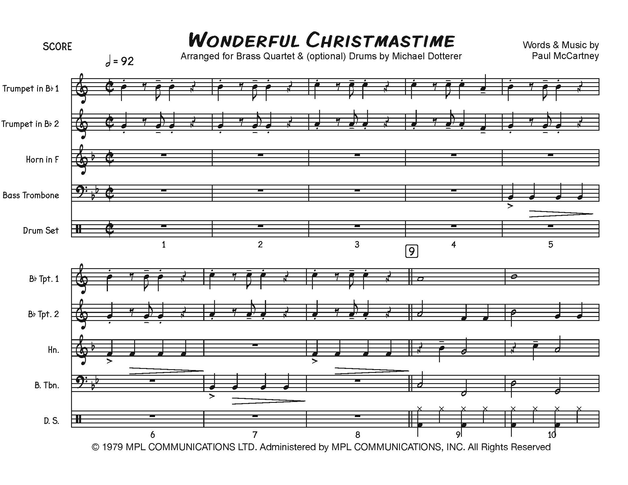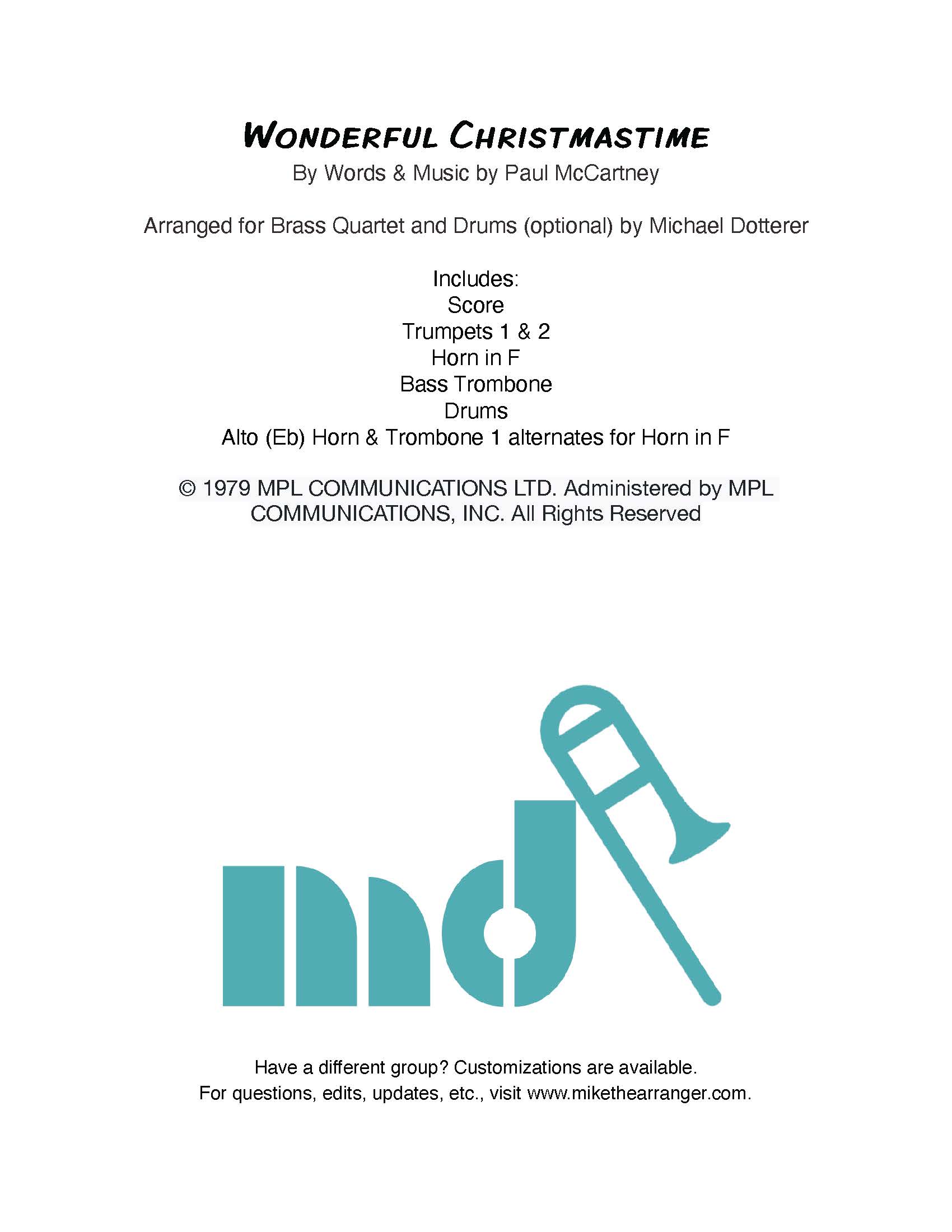 Wonderful Christmastime by Paul McCartney arranged for Brass Quartet and Drums (optional). Parts include: Score, Trumpet 1, Trumpet 2, Horn in F, Bass Trombone, Drums, and alternate Alto (Eb) Horn and Trombone 1 for the Horn in F.
