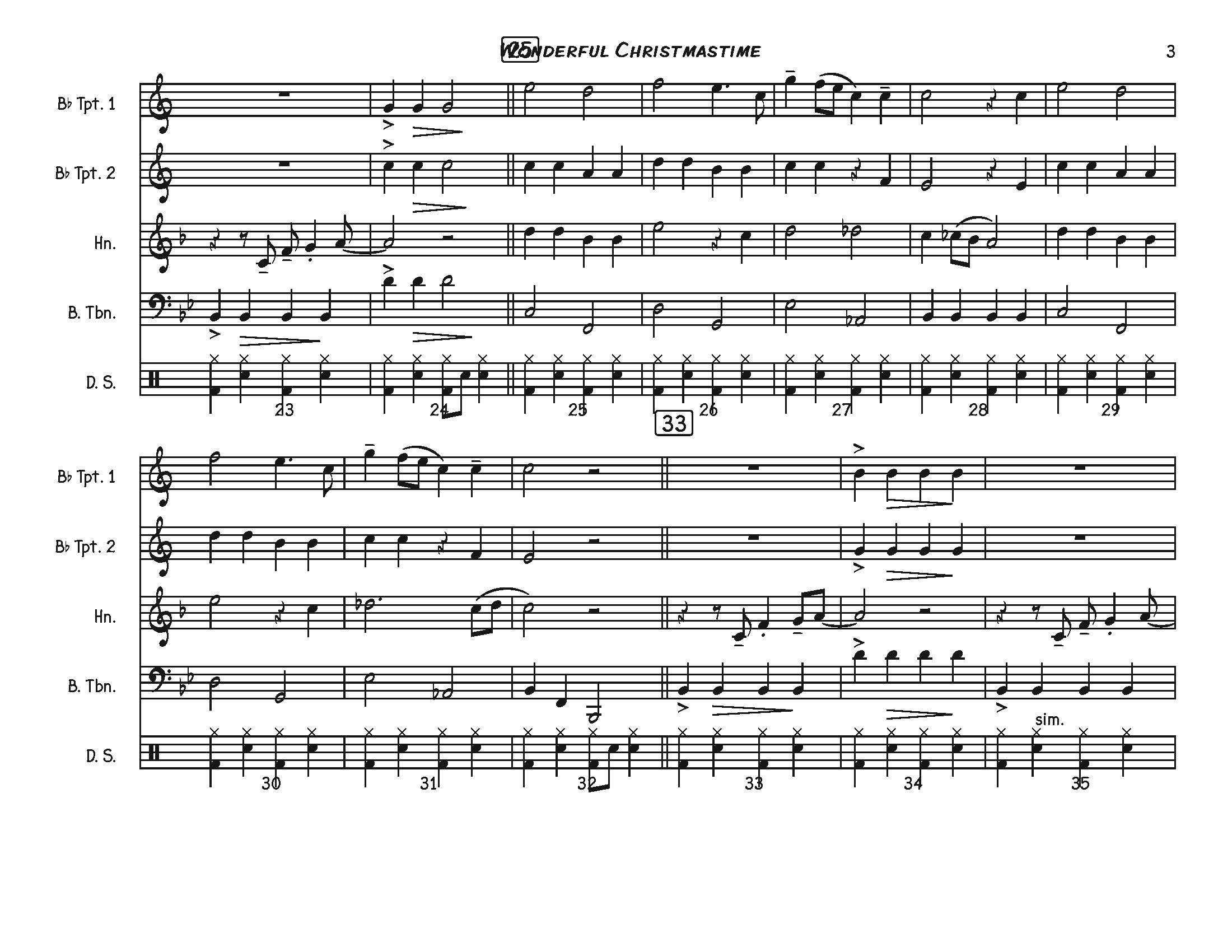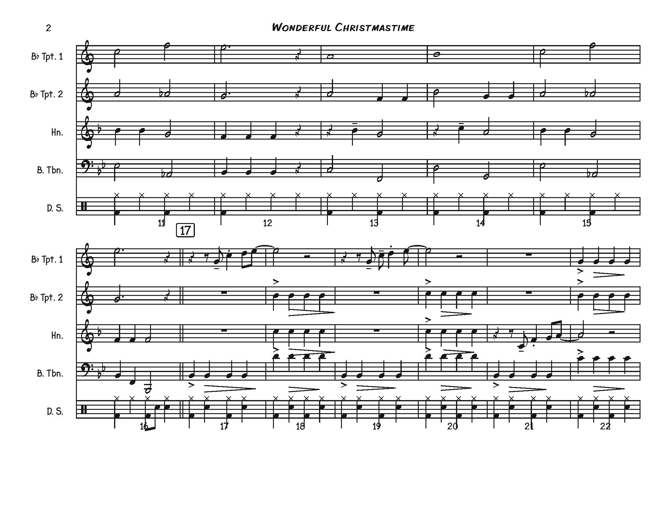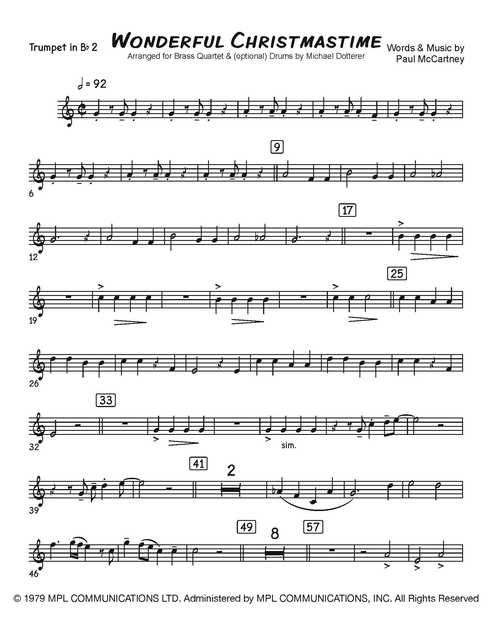 Wonderful Christmastime by Paul McCartney arranged for Brass Quartet and Drums (optional). Parts include: Score, Trumpet 1, Trumpet 2, Horn in F, Bass Trombone, Drums, and alternate Alto (Eb) Horn and Trombone 1 for the Horn in F.